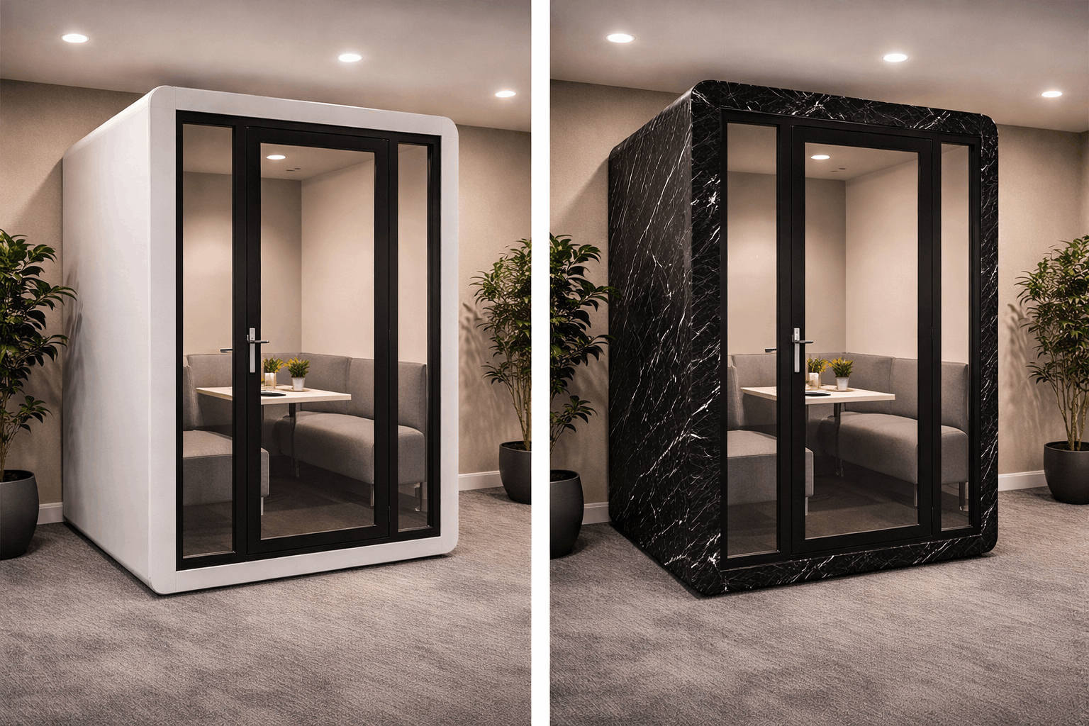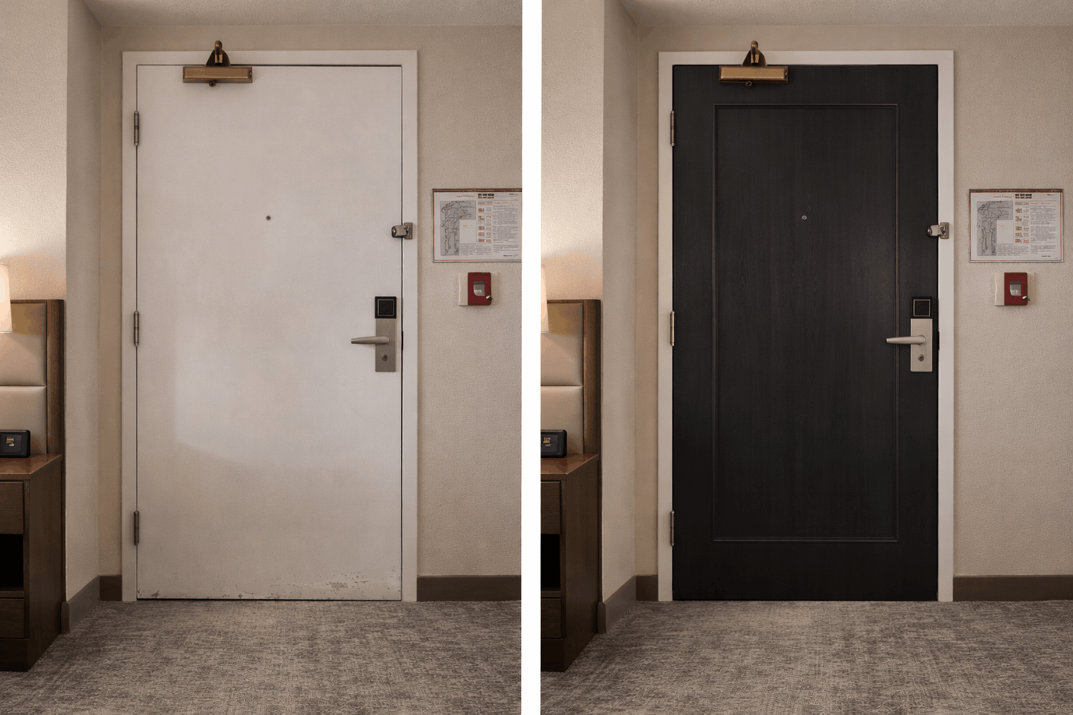 Domestic projects include kitchens, wardrobes, internal doors, furniture and worktops, while commercial applications range from hotel corridors and fire doors to lifts, reception counters, wall panels and meeting pods.